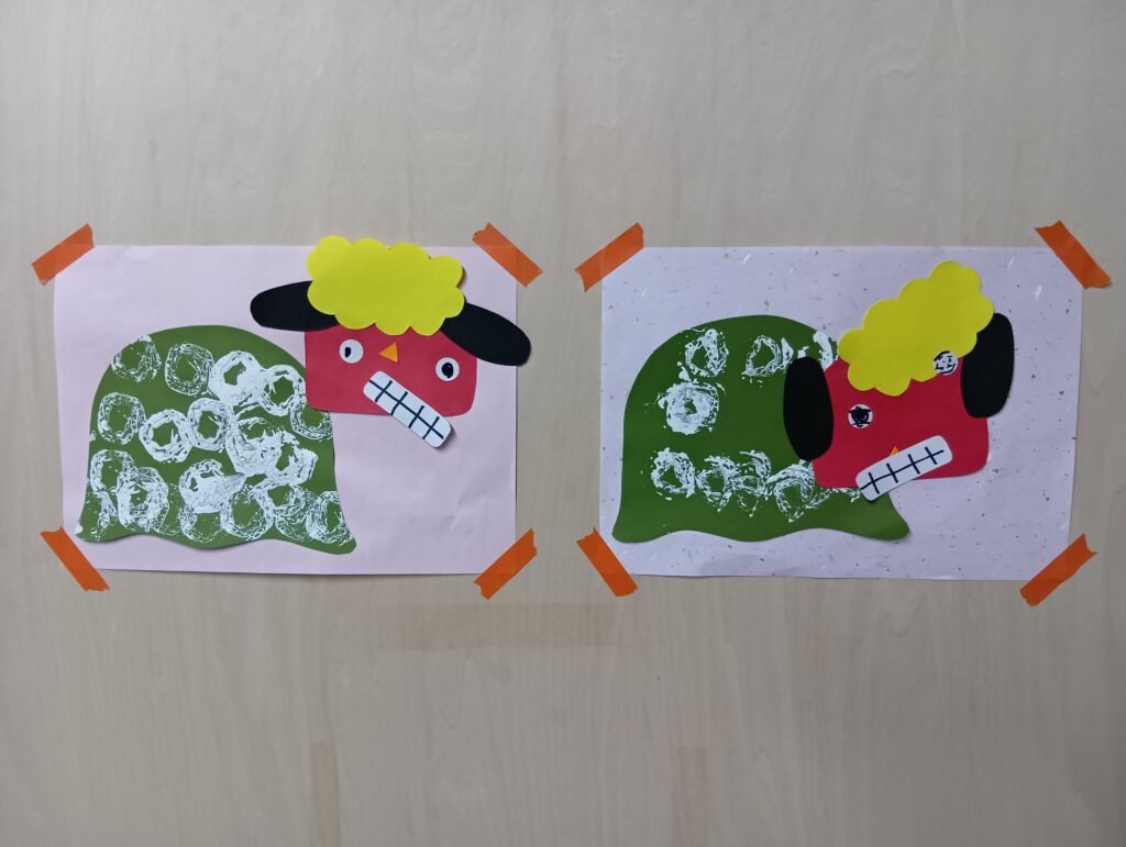 また、お正月の製作としてだるま、獅子舞を作りました!